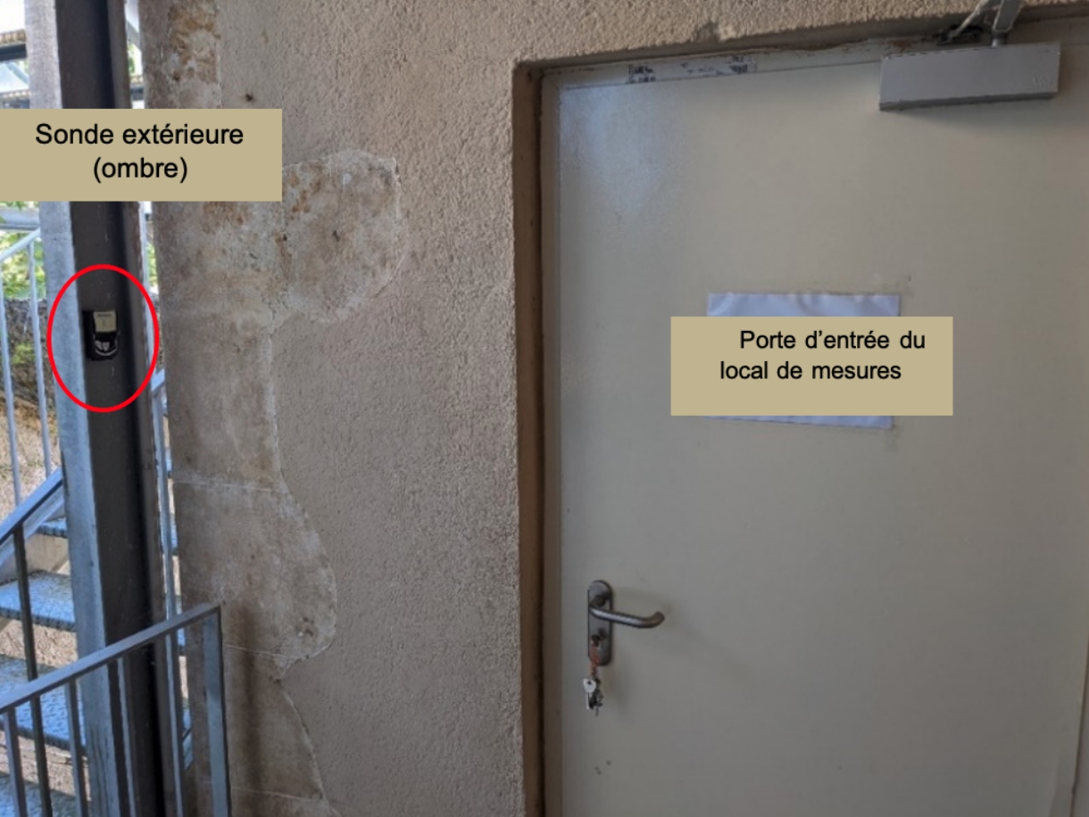 Tel que représenté dans les images ci-après, il a été disposé 5 sondes de mesure, réparties de l’intérieur vers l’extérieur. Trois de ces sondes ont été introduites à respectivement 9 cm, 30 cm et 53 cm dans l’épaisseur du mur (mesures prises depuis l’extérieur), après percement latéral depuis le tableau de la fenêtre sur une vingtaine de cm de profondeur, puis rebouclement soigné avec isolant et enduit pour annuler le plus possible le transfert latéral. Une sonde a été placé à l’intérieur de la pièce, à l’ombre à proximité de la fenêtre. Une autre sonde a été apposée sur le mur extérieur proche de l’alignement des sondes interne au mur, afin de connaitre la température de contact sur le revêtement extérieur, ainsi que l’incidence du rayonnement solaire ponctuel en début de journée, sur cette paroi. Une sixième sonde a été disposé à l’ombre en arrière de ce local, dans un espace extérieur entre les deux parties de bâtiment, totalement protégée de tout rayonnement parasite. Elle a servi a déterminé la température sous abri.